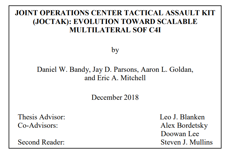 该项目建立在美国国家航空和航天局高级数字顾问合作技术(ADAPT)项目(前身为远程建议和协助(RAA)工具包)的基础上。开发 RAA 套件是为了填补禁止美军随同伙伴部队行动的政策空白。ADAPT 将 RAA 技术从直接行动任务集扩展到所有潜在任务类型。NPS 研究小组建议开发 JOCTAK,这是一种统一的 TAK 解决方案,可汇总并显示来自用户和传感器网络的关键相关信息。与 ATAK 相似,JOCTAK 有可能在单个操作员层面显示特定任务和传感器信息,但也能汇总和即时分析来自整个作战区域多个单元和传感器的数据和信息。这种能力提供了作战层面的 COP,有助于指挥官、参谋人员和战术人员及时做出决策。除了将众多信息流汇总到一个单一的综合系统外,它还将远程建议协助概念重新用于大规模杀伤性武器行动。集成的 TAK 系统将允许不属于国防部或不在联合行动中心的核专家和大规模杀伤性武器专家在应对大规模杀伤性武器行动时为美军和伙伴部队提供远程建议和协助。