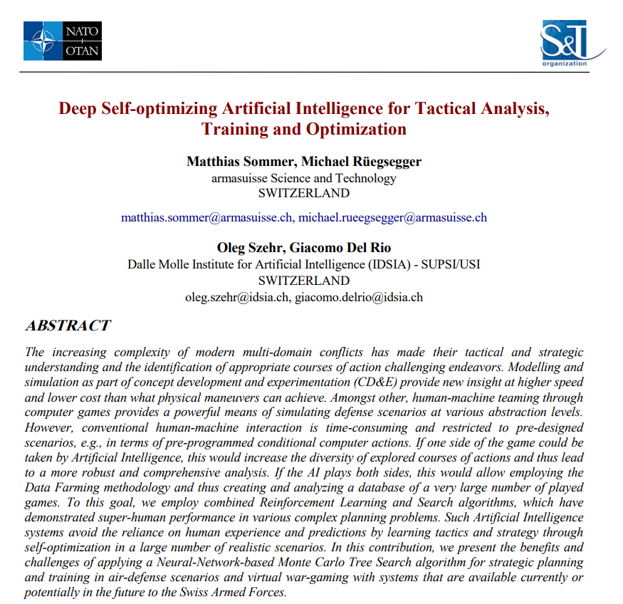 现代多领域冲突日益复杂,使得对其战术和战略的理解以及确定适当行动方案具有挑战性。作为概念开发和实验 (CD&E) 的一部分的建模和仿真提供了新的见解,以更快的速度和更低的成本比物理机动更易实现。其中,通过计算机游戏进行的人机协作提供了一种在各种抽象级别模拟防御场景的强大方法。然而,传统的人机交互非常耗时,并且仅限于预先设计的场景,例如,在预先编程的条件计算机动作。如果游戏的某一方面可以由人工智能来处理,这将增加探索行动过程的多样性,从而导致更强大和更全面的分析。如果AI同时扮演两个角色,这将允许采用数据农场方法,从而创建和分析大量已玩游戏的数据库。为此,我们采用了强化学习和搜索算法相结合的方法,这些算法在各种复杂的规划问题中都表现出了超人的表现。这种人工智能系统通过在大量现实场景中通过自我优化来学习战术和策略,从而避免对人类经验和预测的依赖。在这篇文章中,我们介绍了将基于神经网络的蒙特卡罗树搜索算法应用于防空场景和虚拟战争游戏中的战略规划和训练的好处和挑战,这些系统目前或未来可能用于瑞士武装部队。