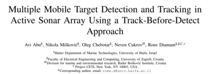 提出了一种利用主动声学传输宽带啁啾信号来探测和跟踪水下移动物体的算法,水听器阵列可接收这些信号的反射。该方法对接收到的反射序列采用先跟踪后检测的方法,从而克服了误报率高的问题。通过延迟和波束成形以及脉冲压缩,为从每个发射探头信号接收到的混响创建一个二维时空矩阵。通过二维恒定误报率(CFAR)检测器对结果进行过滤,以识别与潜在目标相对应的反射模式。多个探头发射的间隔较近的信号被组合成球状,以避免对单个目标的多次探测。使用近似等速(NCV)模型的 "先跟踪后检测 "方法可跟踪多个目标。位置和速度由去偏转换测量卡尔曼滤波器估算。对模拟场景和海上实验的结果进行了分析,海上实验是对贴有 GPS 标签的金头鲷鱼进行跟踪。与两个基准方案相比,结果显示了良好的跟踪连续性和准确性,而且对检测阈值的选择也很稳健。