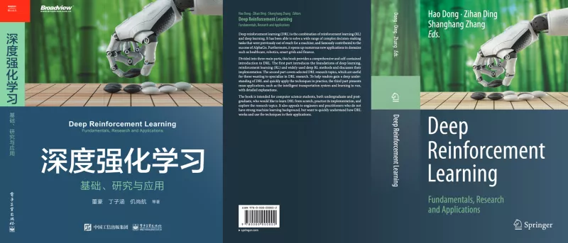 由北京大学前沿计算研究中心助理教授董豪博士等编写的深度强化学习专著《深度强化学习:基础、研究与应用(Deep Reinforcement Learning: Foundamentals, Research and Applications)》英文版于2020年6月由 Springer 发行,中文简体、繁体版先后于2021年6月、2022年1月发行,并于2022年2月对中文简体版开放免费下载。
