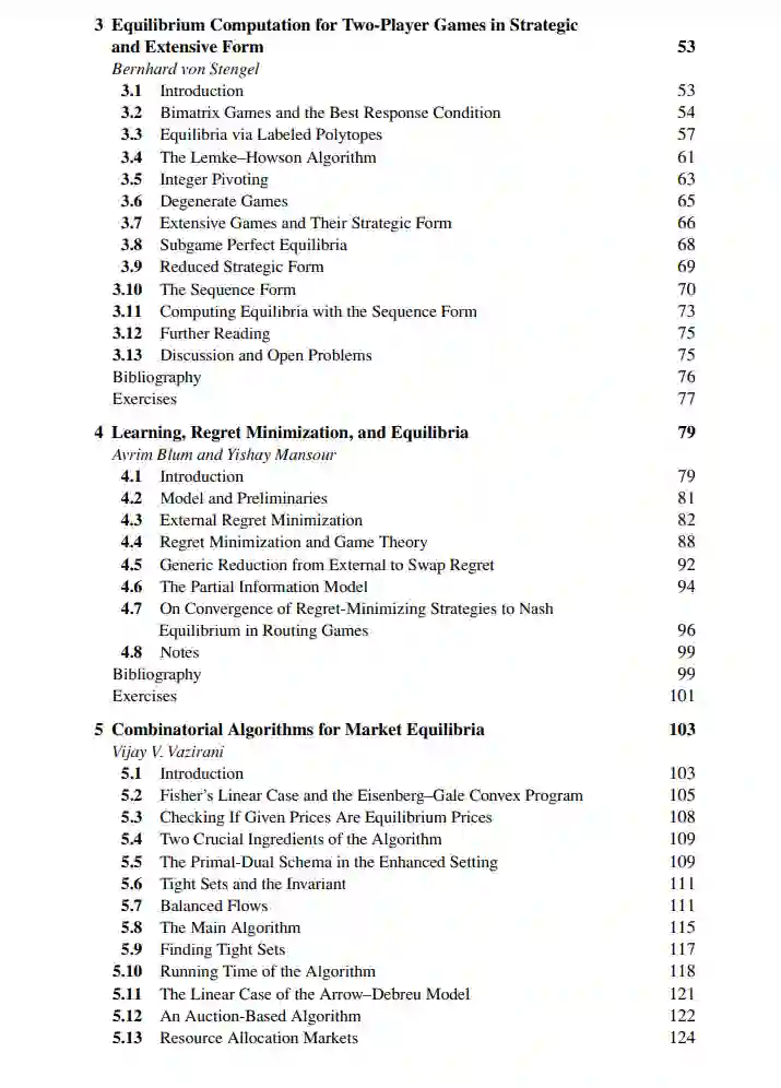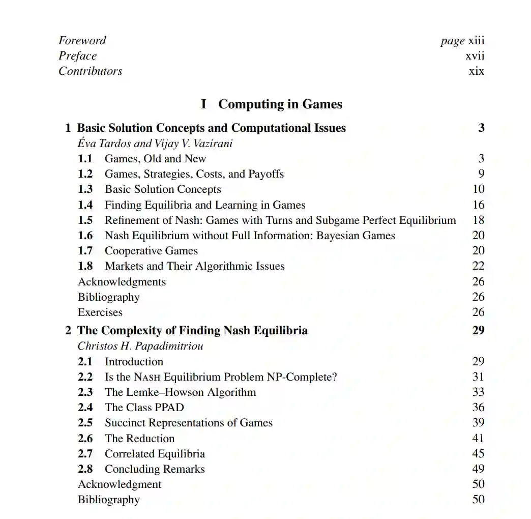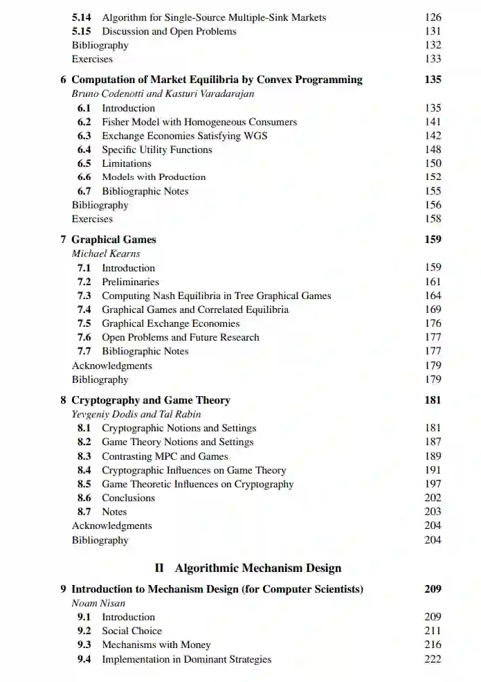 这本书涵盖了跨越算法和博弈论两个领域的内容,并在其他几个领域,包括网络和人工智能等,也有应用。本书的阅读难度定位在计算机科学的初级研究生水平 - 我们希望这使得书籍对各个领域的读者都容易理解。 我们启动这个项目是因为我们相信,现在是出版一本清晰阐述算法博弈论的中心思想和结果的书籍的恰当时机 - 这本书可以作为许多大学已经开设的各类课程的教科书。我们觉得,唯一能在合理的时间内编写出如此广泛内容的书籍的方法,就是邀请这个领域的许多专家为这本全面涵盖该主题的书籍贡献章节。 这本书分为四个部分:前三部分专门讨论核心领域,而第四部分涵盖了一系列主要关注应用的主题。第一章作为预备章节,介绍了整本书中使用的基本博弈论定义。第二部分和第三部分的开篇章节分别为各自的部分提供了介绍和预备知识。其他章节基本上互不依赖。我们要求作者们关注几个能够突出主要问题和技术的结果,而不是提供全面的调研。