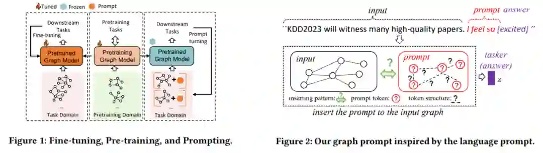 李佳教授获得最佳论文奖(研究方向)。 论文地址:https://arxiv.org/pdf/2307.01504.pdf 论文介绍:最近,预训练和微调范式已成为许多图任务的标准工作流程,因为这些方法可以利用通用的图知识来缓解每个应用中图注释的缺乏。然而,具有节点级、边缘级和图级的图任务千差万别,使得预训练的前提往往与多个任务不兼容。这种差距甚至可能导致对特定应用程序的「负迁移」,从而使得效果不佳。 受到自然语言处理(NLP)中 prompt 学习的启发,因而,本文研究了在图领域中关于 prompting 的主题,旨在弥合预训练模型与各种图任务之间的差距。本文提出了一种新颖的用于图模型的多任务 prompting 方法。 具体来说,该研究首先通过 prompt token、token 结构和嵌入模式统一了图 prompt 和语言 prompt 的格式。通过这种方式,可以将 NLP 中的 prompting 思想无缝地引入到图领域。然后,为了进一步缩小各种图任务与最先进的预训练策略之间的差距,该研究进一步研究了各种图应用的任务空间,并将下游问题重新表述为图级任务。随后,他们引入元学习,以有效地学习更好的图多任务 prompt 初始化,从而使 prompting 框架在不同任务之间更可靠且更通用。本文还进行了大量实验来证明所提方法的优越性。 图 1 为微调、预训练以及 prompting 流程;图 2 为受 NLP 领域中 prompt 启发,得到的图 prompt: