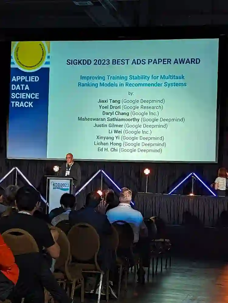 SIGKDD 2023 应用数据科学方向最佳论文奖颁给了谷歌的研究者。其中华人学者包括高级软件工程师 Jiaxi Tang 、软件工程师 Li Wei 、高级软件工程师 Xinyang Yi、 软件工程高级总监 Lichan Hong 以及杰出科学家 Ed H. Chi 。