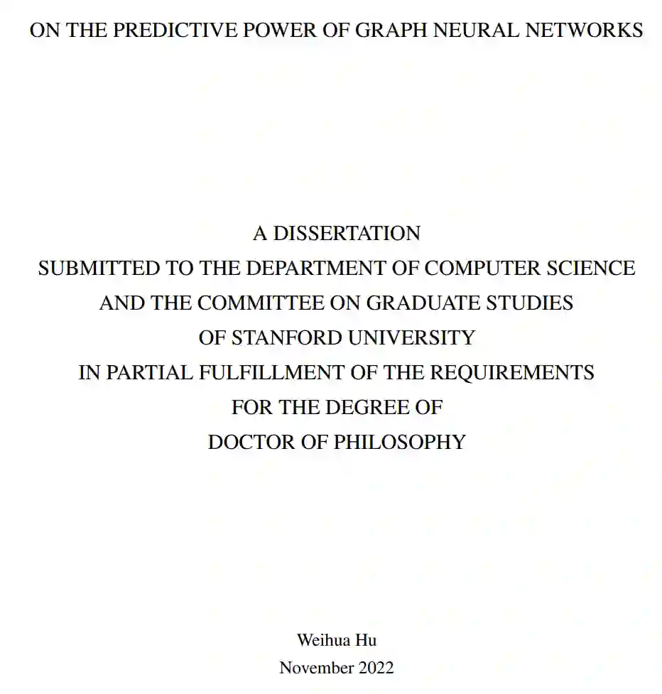 KDD 2023 杰出博士论文奖授予了斯坦福大学(于今年 1 月获得学位)博士 Weihua Hu 的论文《On the Predictive Power of Graph Neural Networks》。