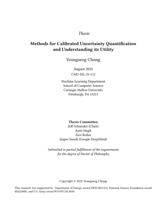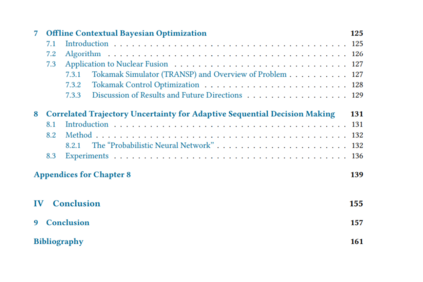 随着机器学习模型在处理复杂数据方面能力的不断提升,它们被赋予了越来越多的预测任务。随着对模型预测依赖性的增强,能够评估某一预测结果是否可靠也变得同样重要。在这一背景下,不确定性量化(Uncertainty Quantification, UQ)扮演着关键角色,它为模型预测提供置信度的度量。 本论文在机器学习中的不确定性量化问题上,分三个阶段展开研究。第一部分综述了 UQ 的评估方法以及开源软件,这些软件为预测不确定性的评估、可视化和再校准提供了多种工具。第二部分讨论了旨在生成校准良好的回归模型预测不确定性的算法,此类模型会对连续值输出生成分布。本部分的第一项工作提出了一套用于训练单变量概率回归模型的算法,而第二项工作则将其扩展到多变量情形。第三部分则聚焦于在决策场景中对预测不确定性的利用。不同的应用环境决定了不确定性的使用方式,我展示了一系列相关研究,涵盖了单步决策、序列决策以及基于模型的强化学习场景。