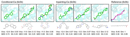 图4 在 Binding MOAD 上训练的DiffSBDD模型针对人类受体蛋白(PDB:6c0b)进行了评估。比较了条件和修复方法(两者都是),并给出了每个模型中亲和力最高的三个分子。