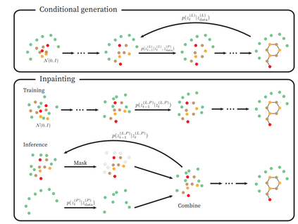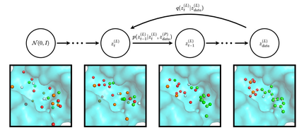 由于该模型被训练以近似配体-口袋对的无条件联合分布,除了将蛋白质和配体节点特征嵌入公共空间的全连接神经网络外,该训练过程与 Hoogeboom 等人开发的无条件分子生成过程相同。已知蛋白质口袋的调节完全委托给采样算法,这意味着这种方法不仅限于配体修复,而且原则上允许在不重新训练的情况下掩盖和替换配体口袋系统的任意部分。