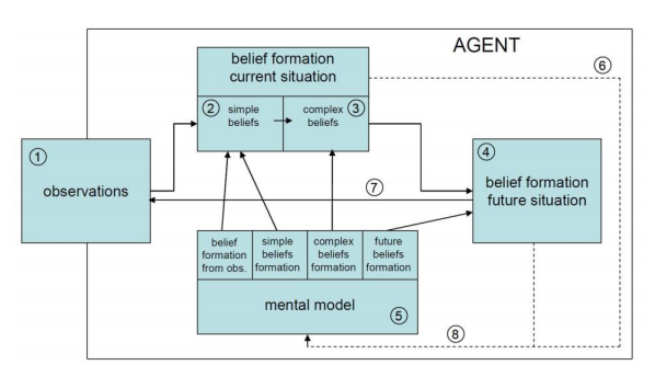 在Smart Bandits中用于智能CGF的基本SA模型(见Hoogendoorn, van Lambalgen & Treur, 2011)包括五个部分。(1)观察,(2/3)对当前情况的信念形成,(4)对未来情况的信念形成和(5)心理模型。对当前情况和未来情况的信念通过阈值函数被激活(接收一个激活值),这是一种从神经学领域采用的技术。图1中的SA模型代表了用于形成信念的领域的知识。人类使用专门的心理模型,这些模型代表了各种观察和关于环境的信念形成之间的关系,反过来,这些模型又指导了要进行的进一步观察。