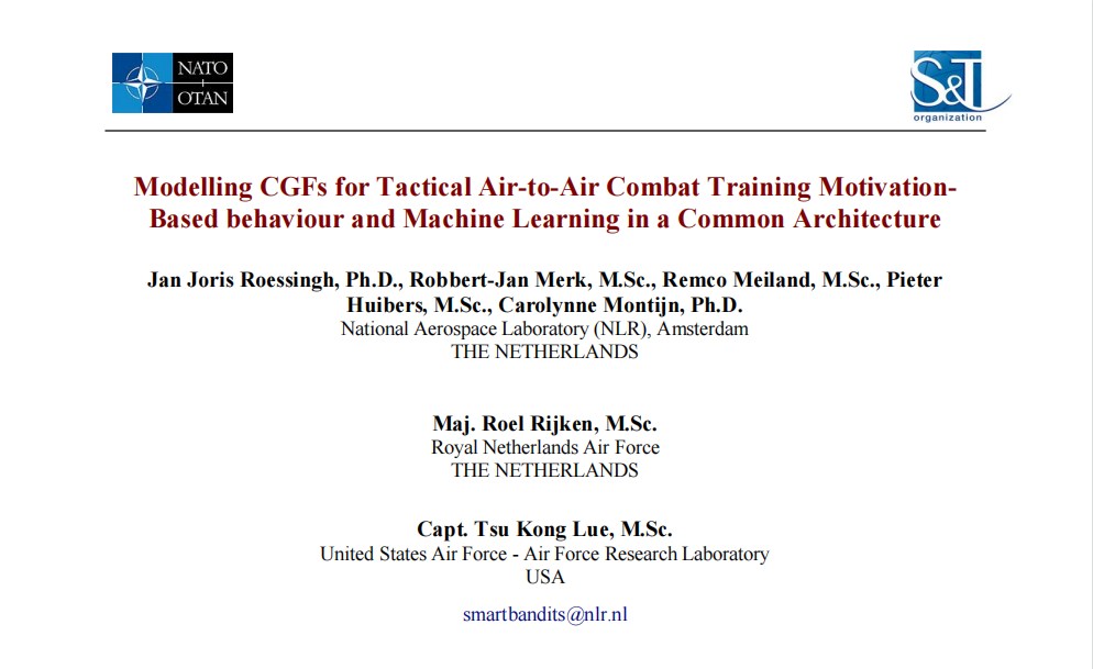 荷兰的Smart Bandits项目旨在开发显示真实战术行为的计算机生成部队(CGF),以提高战斗机飞行员模拟训练的价值。尽管重点在于展示空对空任务中的对抗行为,但其结果更广泛地适用于模拟领域。