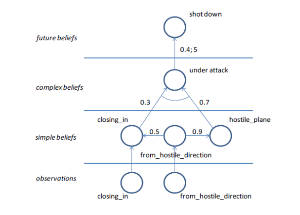 由于像SA模型这样的认知模型通常有一大套相互关联的参数,使用主题专家来确定它们的(初始)值是很麻烦的,而且是投机性的和劳动密集的。这就需要使用进化学习技术来为上述观察、简单信念、复杂信念和未来信念之间的联系确定适当的权重。图2给出了第2.3节中提到的SA模型的网络表示的一个简化例子(取自Hoogendoorn, van Lambalgen & Treur, 2011)。