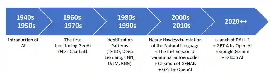 近年来,GenAI 经历了一场引人注目的变革,其标志是非凡的创新和快速的进步[8] [9]。人工智能的时间轴始于二十世纪四五十年代人工智能作为一门概念性科学学科的出现。上世纪六七十年代诞生的 ELIZA 聊天机器人是第一个声名鹊起的 GenAI。这一革命性的演示凸显了机器人模仿人类语言的能力。80 年代和 90 年代,随着先进的模式识别方法越来越流行,人工智能在分析连续数据和模式方面的发展变得更加复杂,因此也更加有效。第一个变异自动编码器(VAE)在自然语言翻译方面表现出了非凡的能力。OpenAI 在 2000 至 2010 年代开发了 GPT。与此同时,GenAI 模型也得到了发展,并在 20 世纪 20 年代推出了一系列创新平台和技术,包括 DALL-E、谷歌的双子座、猎鹰 AI 和 Open AI 的 GPT-4。这些进步代表着这门学科的成熟,为内容制作、解决问题以及模拟人类智能和创造力带来了前所未有的能力。它们也为这一学科的进一步发展铺平了道路。GenAI 的发展时间表见图 1。