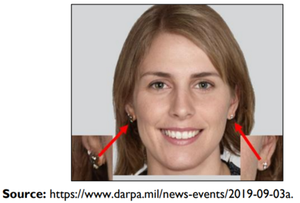 SemaFor 计划以 MediFor 技术为基础,开发能够自动检测、归因和描述(即识别良性或恶意)各类深度伪造信息的算法。该计划将对语义不一致的地方(如图 1 中 GAN 生成的图像中出现的不匹配耳环,或不寻常的面部特征或背景)进行编目,并将可疑的深度伪造图像优先提交人工审核。DARPA 在 2024 财年为 SemaFor 申请了 1800 万美元,比 2023 财年的拨款少 400 万美元。SemaFor 和 MediFor 开发的技术旨在提高对敌方信息行动的防御能力。