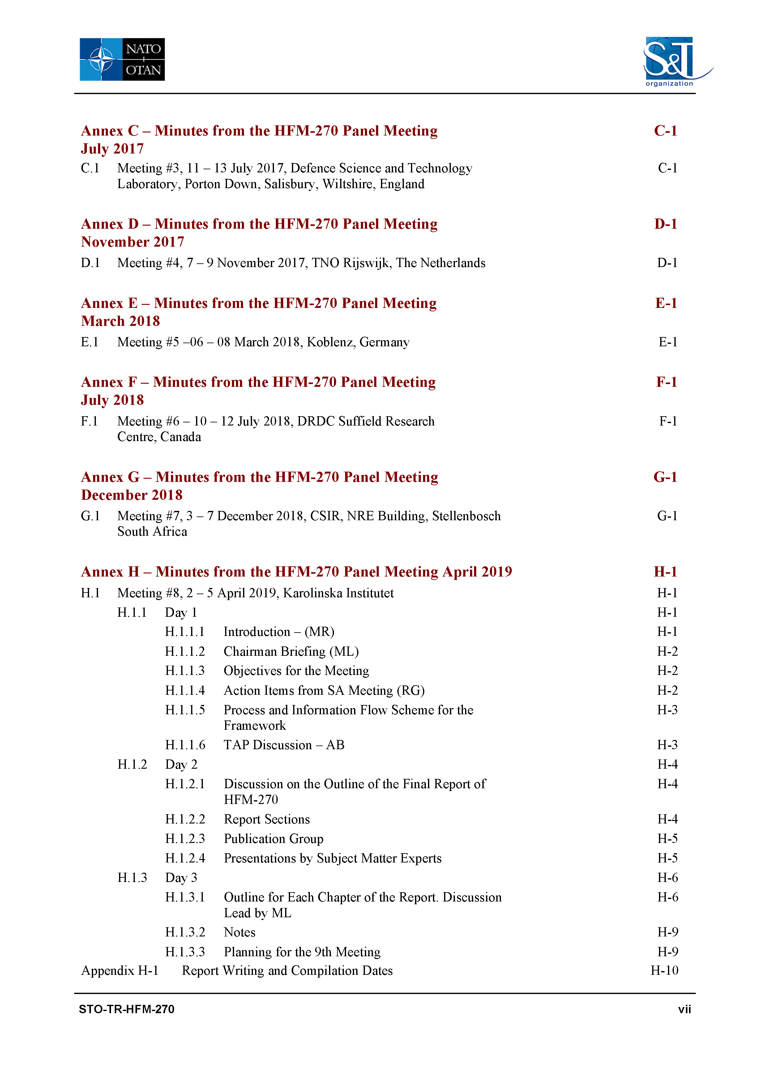 RTG成员成立了三个工作组(WG),专注于PoW中描述的具体交付成果。词典工作组的任务是在HFM-234 RTG开发的爆炸伤害研究术语综合词典的基础上,开发常用计算建模和模拟术语的综合词典;出版物工作组的任务是确定并指导RTG的工作在适当的同行评审期刊上发表;以及TAP工作组的任务是为HFM-270后续RTG起草一个TAP,为该框架制定标准化和验证标准及方法。