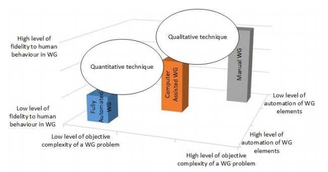 图2. 在定量和定性技术格局中的WG分类(手工WG、计算机辅助WG和全自动WG)[21]及其与WG问题的客观复杂性水平、WG要素的自动化水平和WG中人类行为的保真度水平的关系