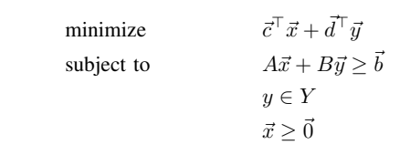 假设一个问题分两个或多个阶段发生,后面阶段的决策取决于前面阶段的结果。第一次尝试对第一阶段的问题进行决策时,事先不知道关于后面阶段决策的最优性。第一阶段的决策是主问题,而后续阶段被视为独立的子问题,其信息被传递回主问题。如果检测到任何违反子问题约束的情况,该约束将被添加到主问题中,然后被解决。主问题代表了一个初始的凸集,它被从子问题中收集到的信息进一步约束,因此随着信息的增加,可行空间会缩小。如果矩阵A和B代表约束条件,Y代的可行集,我们要解决的问题被表示为最小化问题,如下所示: