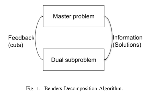 在图1中,我们说明了Bender分解算法。一旦得到初始主问题和子问题,在得出初始MP和子问题后,算法从主问题开始,然后在它们之间交替进行,直到找到一个最优解。较小的问题基本上是多项式时间可计算的问题,而它们的独立性允许有效利用并行性。