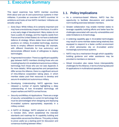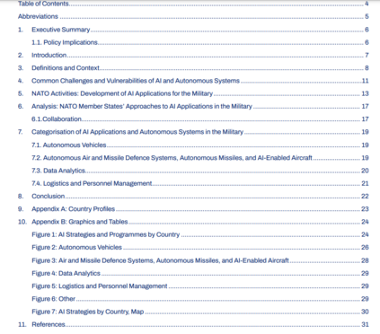 该报告概述了每个北约国家在军事人工智能方面的观点和雄心,并概述了它们目前对人工智能技术的使用。在附录A中,报告探讨了每个国家在军事和国防背景下与人工智能的接触程度,审查了国家人工智能战略和当前人工智能技术使用的公开来源。