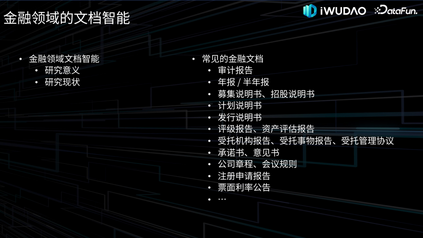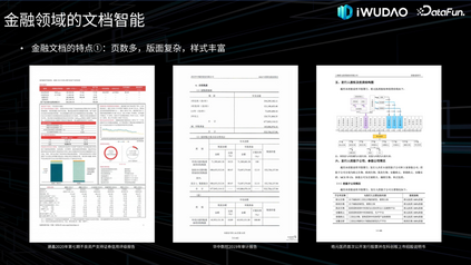 导读 吾道科技(iWudao Tech)一直致力于将 AI 技术和金融领域知识相结合,面向一级市场提供金融大数据和资讯服务。站在 2024 年二季度,金融行业试水大模型应用已经一年半了,在以大模型为代表的 AI 技术驱动下,金融行业的众多技术路线、业务场景迎来升级。在这个大变革的时代下,本次分享将聚焦于文档智能在金融领域的应用。文章主要包括以下五大部分: