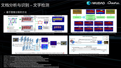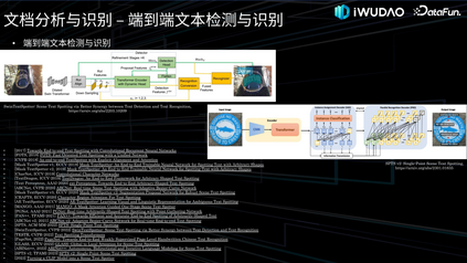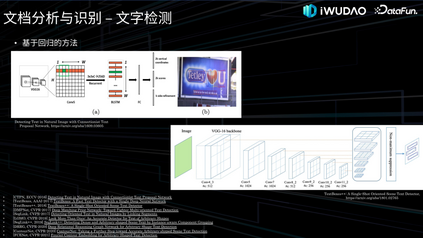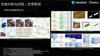 另外一个工作是基于多模态融合的版面分析工作,通过实验我们发现 VSR 等多模态模型和基于 Mask R-CNN 等分割模型相比,视觉上相似目标区域的识别精度提升明显,如图所示,文本段落和表格附注的视觉特征很相似,加入语义信息后,版面分析的精度提升显著。3. 内容识别接下来介绍内容识别的工作,将分别介绍文本检测与识别、表格识别和图形识别。(1)文本检测与识别文本检测与识别,也是我们常说的光学字符识别(OCR),接下来我会分别介绍一下二阶段也就是先文字检测再文本识别的技术以及端到端的方法。