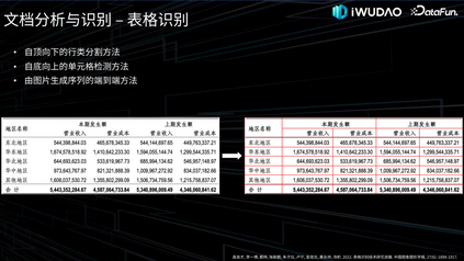表格识别的目标是识别出表格的布局结构、层次结构等,将表格视觉信息转换成可重建表格的结构描述信息,这些表格结构描述信息包括:单元格的具体位置、单元格之间的关系和单元格的行列位置等。在当前的研究中,表格结构信息主要包括以下两类描述形式:①单元格的列表(包含每个单元格的信息:行列位置、单元格坐标、文本坐标及内容等);②表格的逻辑结构(HTML、Latex 等)。表格识别的方法主要分为自顶向下的行类分割方法、自底向上的单元格检测方法、由图片生成序列的端到端方法,接下来我会具体介绍这三类方法的处理流程及特点。