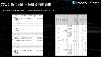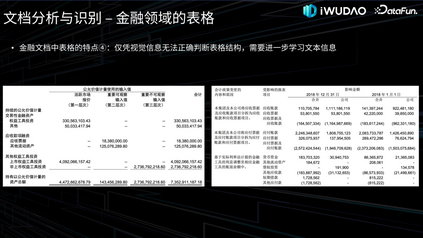 从图像质量的角度来看,金融领域也存在不少歪曲、模糊等低质量画面的文档,尤其是一些拍照扫描材料或年代久远的文档,后面会在图像处理中简述这方面的原因及修复工作。另外,金融文档也常见密集小尺寸的文本对象,如图中的财务报表,往往都是至关重要的数据。再加上印章、水印的干扰,尤其是黑白印章的覆盖,使得后续的内容识别任务相当困难。以上就是金融领域文档智能的特点和面临的挑战。03****