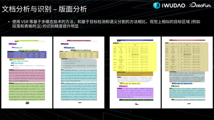 版面分析的目的是将文档图像分割成不同类型内容的区域并分析区域之间的关系,是内容识别之前的关键步骤。一种方式是采用基于目标检测或实例分割的路线,Faster R-CNN、Mask R-CNN 等通用框架被用来对文档图像中的目标区域进行分割。近年来随着基于 Vision Transformer 和多模态技术的提出,版面分析技术得到进一步发展,比如这里贴出的海康威视在 ICDAR-2021 发表的工作 VSR、以及阿里在 ICCV-2023 发表的工作 VGT,都是我们常用的模型,另外,LayoutLM 系列模型除了文档理解任务以外,版面分析也是其工作一个主要任务。