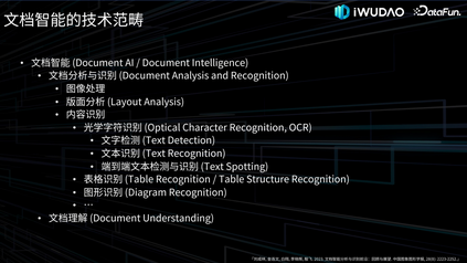文档智能的技术范畴首先介绍一下文档智能技术范畴。 文档是指含有文字的纸张、图像或电子文件,随着数字化智能化的发展,对各行各业中图文并茂的富格式文档进行分析识别与理解具有广泛的应用需求。文档智能又称为 Document AI 或 Document Intelligence,包含文档分析与识别、文档理解两个技术领域。文档分析与识别的流程,是从输入文档图像到输出 HTML 等结构化数据,中间经过图像处理、版面分析、内容识别等主要环节,每个环节有很多不同的技术问题。