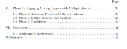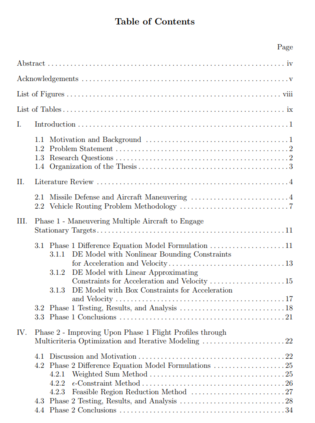 本论文的其余部分组织如下。第二章讨论了与国防、飞行器路由问题和涉及差分方程的数学编程公式有关的文献,以操纵或路由实体。下面的研究分三个不同阶段进行。第三章介绍了第一阶段所研究的工作,该阶段开发并测试了操纵多架航空器来对付静止目标的替代模型。在第四章中提出,第二阶段的研究探讨了替代的数学编程模型的增强,以创建研究第一阶段的可行的飞行轮廓。在第五章中,介绍了第三阶段研究的工作,其中开发和测试了一个最终模型,以操纵多架航空器来对付移动目标。第六章以工作的主要成果对论文进行了总结,并介绍了未来关于时空网络路由模型主题的可能研究途径。