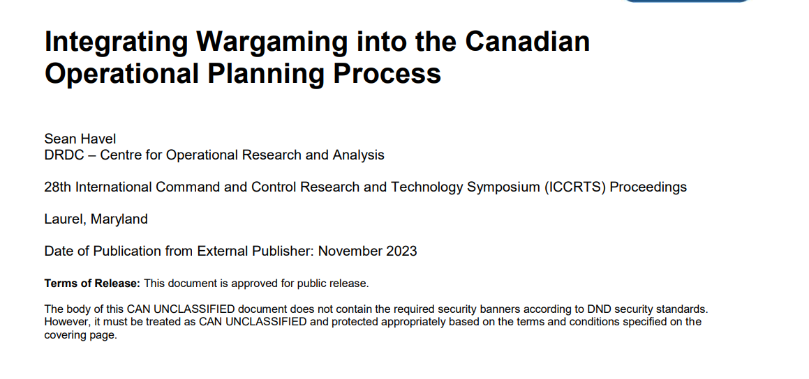加拿大部队(CF)的作战计划是一个结构化流程,用于确定完成指定作战任务的最佳方法,并规划未来可能的任务[12]。本文探讨了将实验兵棋推演纳入作战规划过程(OPP)周密计划的问题,将其作为理解和概述复杂系统的分析工具。由于时间限制,本文没有考虑 OPP 的危机规划流程。OPP 本身分为五个阶段: