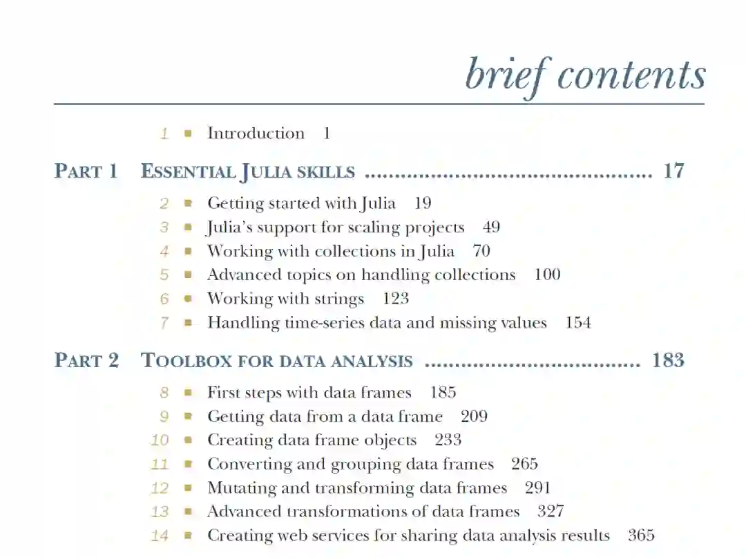 Julia for Data Analysis教你如何使用Julia编程语言处理核心数据分析任务。在练习数据转换、可视化等技术的同时,您将从回顾语言基础开始。然后,您将通过引人入胜的示例掌握基本的数据分析技能,如检查货币兑换,解释时间序列数据,甚至探索国际象棋谜题。在此过程中,您将学习轻松地将现有数据管道传输到Julia。 Julia是为数据科学家的独特需求而设计的:它具有表现力,易于使用,同时还提供超快的代码执行速度。Julia for Data Analysis向您展示了如何充分利用这种神奇的语言来读取、写入、转换、分析和可视化数据——这是一个有效的数据管道所需的一切。它是由Bogumił Kamiński编写的,Julia的顶级贡献者之一,StackOverflow上的#1 Julia answerer,以及Julia的核心数据包DataFrames.jl的首席开发人员。它引人入胜的实践项目让你迅速投入行动。此外,你甚至可以将你新的Julia技能用于通用编程! Julia是一种很棒的数据分析语言。它易于学习,速度快,适用于从一次性计算到全面数据处理管道的所有工作。无论你是在寻找一种更好的方法来处理日常业务数据,还是刚刚开始数据科学之旅,学习Julia都会给你带来一项有价值的技能。