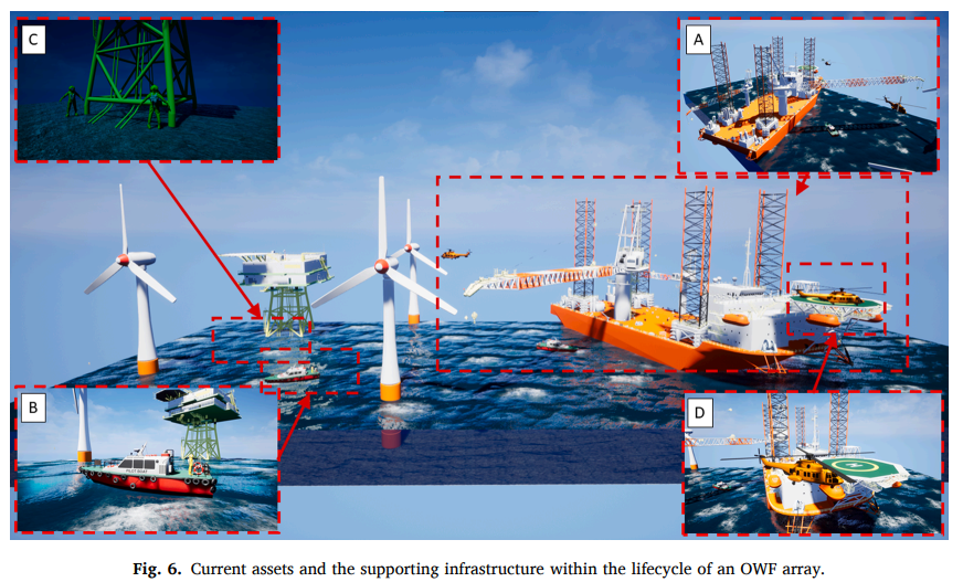 扩大海上风电的生态问题--部署碳密集型的现场支持船,包括直升机、船员转移船、重型自升式船和服务操作船,这些船只用于维护OWF和作为工程师在海上生活的中心。这导致了干扰,并可能对居住在这些地区的生境和物种产生持久的不利影响[31]。