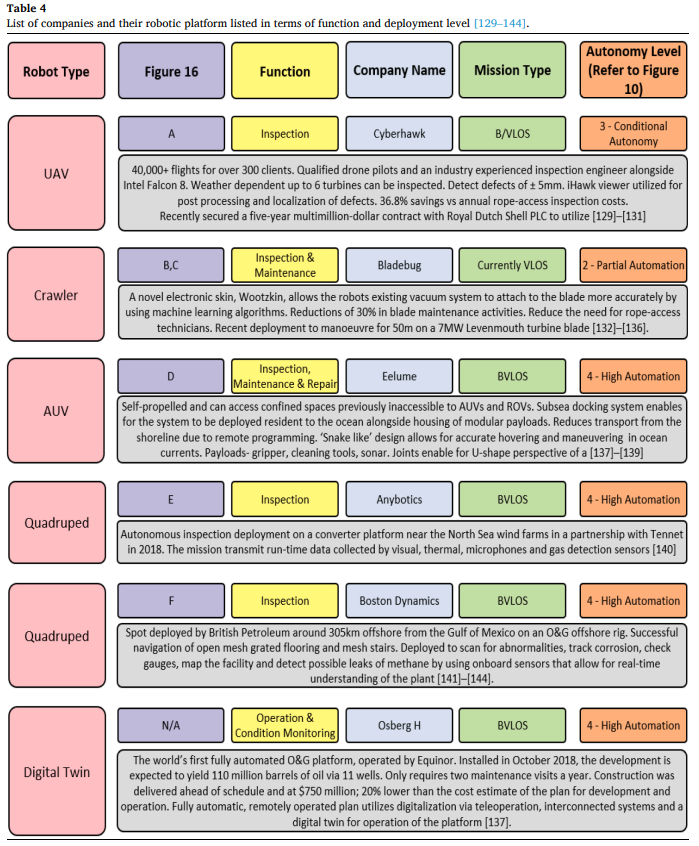 减少运行和维护成本--运行和维护支出占到了海上风电场总生命周期成本的25%;这是进一步发展海上风电领域需要解决的障碍[24]。抑制运行和维护发展的财务风险包括涡轮机停机时间、管理船只和人员、危险的天气条件、海况和越来越远的岸边距离。为了降低成本,必须为资产检查和维护的RAI部署制定新的标准操作程序。这种程序的改进允许更频繁的干预,并产生检查和维修的频率和质量的改善,也导致人员安全的改善[25]。