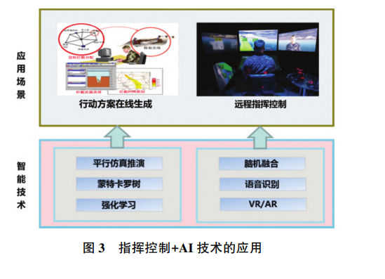 在指挥控制领域,主要可在作战方案推演、远程 指挥控制等方面应用平行仿真推演、脑机融合等智 能技术,实现决策优势,如图 3 所示。 1)应用于作战方案推演。通过深度学习技术, 训练智能体对战场交战规则、作战指挥决策、事件认 知推理等知识进行学习和模拟,提升智能体认知的 智能性、实时性与科学性。在战场态势实时共享的 基础上,对战场数据进行智能化处理,通过平行仿真 推演作战方案,形成对对手下一步可能的军事行动 和战场演进趋势的智能预测,自动匹配最佳行动策 略[35] 。2007 年,DARPA 安排了名为“深绿”的系统 研发项目[36] ,旨在建造一套人工智能作战辅助决策 系统。该系统利用平行仿真、动态博弈等技术,基于 战场实时数据,可动态模拟战场敌我双方作战行动, 并预测战场态势走向,帮助指挥官提前思考,缩短决 策时间。DARPA 于 2018 年启动了 “ 指南针” 项 目[37] ,该项目主要通过利用大数据分析、博弈对抗 等方法对战场数据进行分析,构建敌方作战行动与 路径模型,帮助作战人员确定敌方真实作战意图,制 定并选取我方最有效的行动方案。