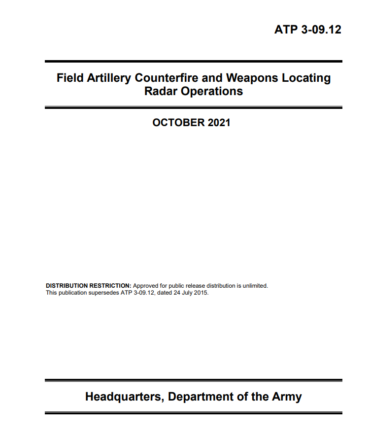 ATP 3-09.12分为四章和十一个附录。 第1章 野战炮兵反击和目标定位简介。 第2章 角色和责任。 第3章 野战炮兵反火力/武器定位雷达部门和人员。 第4章 武器定位雷达的使用考虑因素。 附录A 自动化目标数据处理。 附录B 友军射击日志。 附录C 嵌入式训练。 附录D 面具的考虑因素。 附录E 支持要求。 附录F 工具和程序。 附录G 火箭炮迫击炮(RAM)的警告。 附录H AN/TPQ-53武器定位雷达系统特性。 附录I AN/TPQ-50武器定位雷达系统特性。 附录J AN/TPQ-36武器定位雷达系统特性。 附录K 目标获取表。