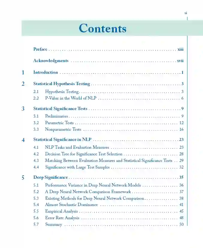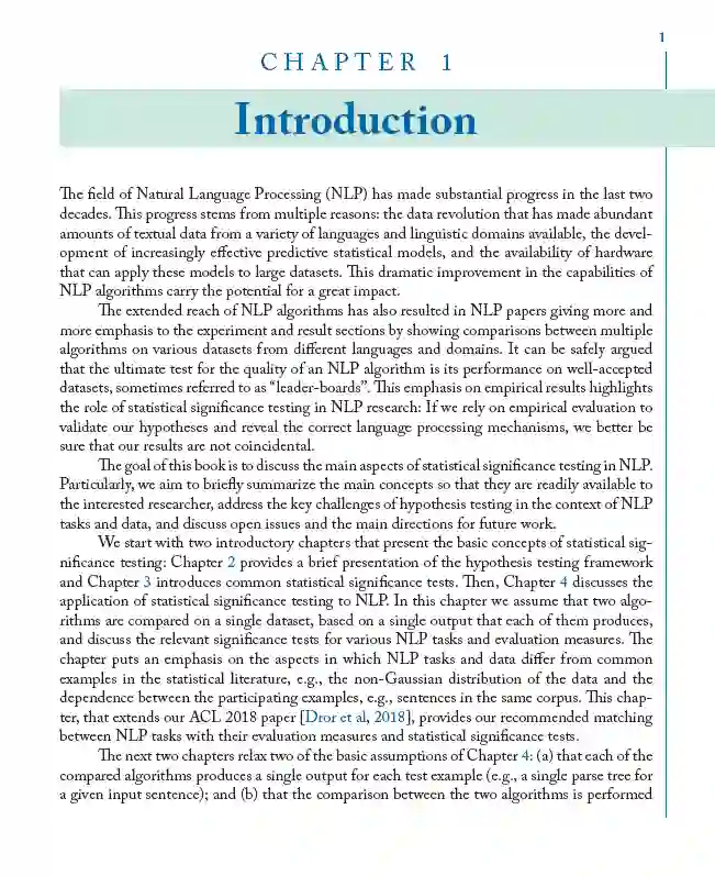 本书的目标是讨论NLP中统计显著性检验的主要方面。我们贯穿全书的指导假设是,NLP研究人员和工程师要处理的基本问题是,一种算法是否可以被认为比另一种算法更好。这个问题推动了这个领域的发展,因为它允许不断发展更好的技术来应对语言处理的挑战。在实践中,研究人员和工程师希望从一组有限的实验中得出正确的结论,这一结论应该适用于其他使用他们没有可用数据集的实验,或由于时间和资源有限而无法执行的实验。因此,本书从两种算法的实验比较的角度讨论了在自然语言处理中使用统计显著性检验的机遇和挑战。我们涵盖的主题包括为主要的NLP任务选择合适的显著性检验,处理非凸深度神经网络显著性检验的独特方面,以统计有效的方式在两种NLP算法之间进行大量的比较(多重假设检验),最后,数据和现场实践的性质带来了独特的挑战。