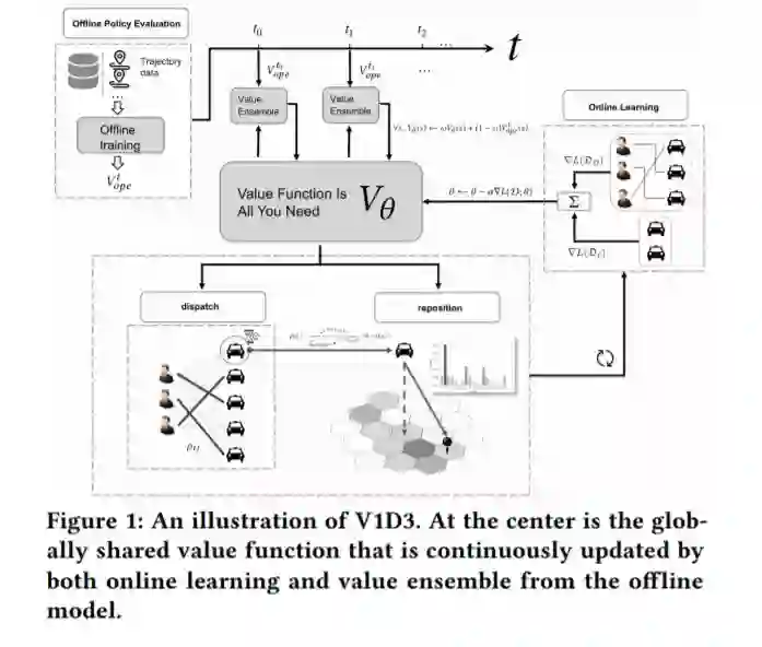 滴滴、优步、Lyft等大型代驾平台,将一个城市的数万辆汽车连接到了全天数以百万计的代驾需求上,通过订单调度、车辆重新定位等任务,为提高运输效率提供了巨大的希望。然而,现有的研究通常是在简化的背景下考虑这两项任务,这很难解决两者之间的复杂相互作用、供需之间的实时波动以及由于问题的大规模而需要的协调。在本文中,我们提出了一个统一的基于价值的动态学习框架(V1D3)来处理这两个任务。该框架的中心是一个全球共享的价值函数,它使用实时平台事务生成的在线体验不断更新。为了提高采样效率和鲁棒性,我们进一步提出了一种结合快速在线学习和大规模离线训练的周期集成方法,该方法利用了丰富的驾驶员历史轨迹数据。这使得所提出的框架能够快速适应高度动态的环境,有力地推广到循环模式,并在管理车辆的群体中驱动隐式协调。基于真实数据集的大量实验表明,与最近提出的其他方法相比,这两种方法在这两种任务上都有很大的改进。特别是,V1D3在KDD杯2020 RL比赛中的表现优于调度和重新定位赛道的一等奖得主,在提高驾驶员总收入和用户体验相关指标方面取得了最新成果。
