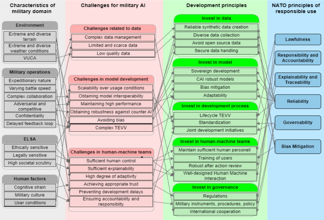 人工智能(AI)预计将成为获得军事优势的关键技术。尽管其潜力巨大,用于AI的军事研发资金分配仍只占该领域总投资的很小部分。AI算法的最新进展主要源自商业软件公司。然而,由于作战环境、军事行动性质、数据需求及法律约束等方面的差异,将这些民用进展直接转化为军事应用颇具挑战。这些因素使得军事AI系统的设计、开发、部署和使用复杂化,常导致民用开发的模型与算法不适用。虽然许多民用法规不适用于国防领域,尤其在战时,但国际人道法(IHL)依然有效。北约AI战略中确立了“负责任使用原则”(PRU),并由数据与AI审查委员会(DARB)进一步阐述。尽管诸多方面和考量影响着军事AI系统的设计,但本文仅聚焦于源自军事环境的那些因素。