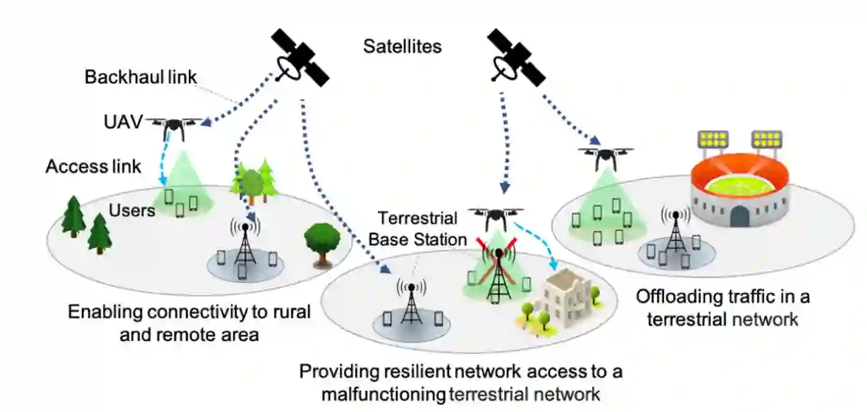图 1. 使用无人机辅助 SAGIN 为位于农村/偏远地区和地面网络故障/过载的地面网络用户提供网络接入的用例。在这些案例中,无人机被视为空中基站。