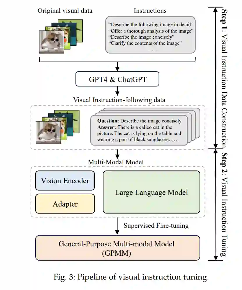 视觉指令调优【9】旨在利用视觉指令跟随数据对大型视觉模型进行微调,以构建通用多模态模型(GPMM)。视觉指令调优的流程通常包括两个阶段,即视觉指令跟随数据的构建和视觉指令调优,如图3所示。本节介绍视觉指令调优的基础,包括构建视觉指令跟随数据的常见方法、用于编码图像和文本数据的网络架构、视觉指令调优框架、目标以及用于评估的下游任务。
