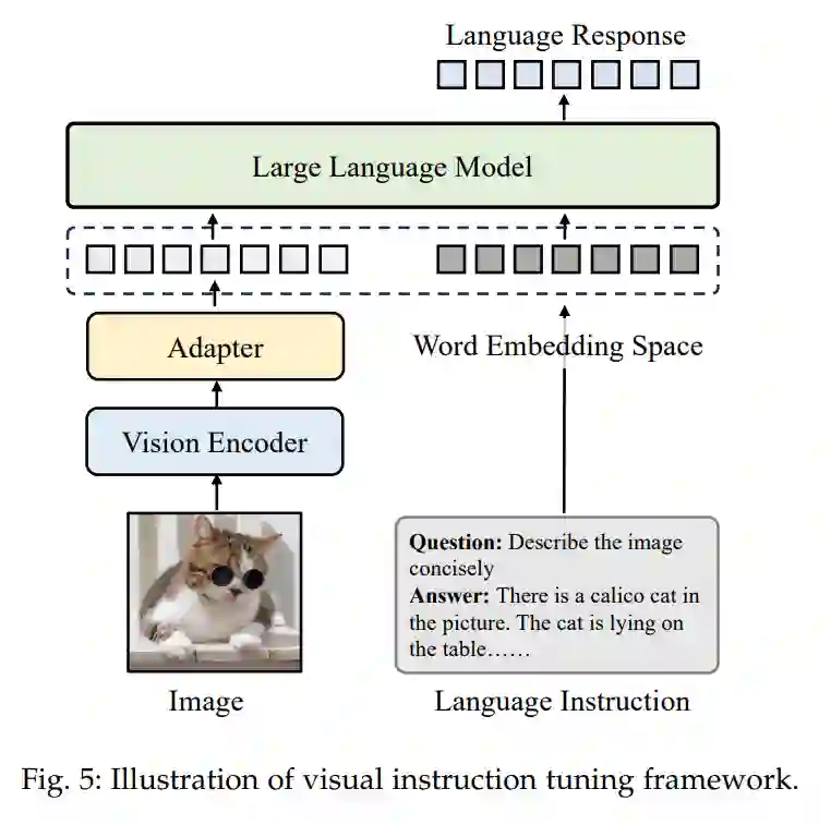 广泛采用的视觉指令调优框架如图5所示,通常包括视觉编码器、大型语言模型(LLM)和适配器。在这个框架中,视觉编码器用于从图像中提取特征。然后适配器作为桥梁,将这些图像特征转换到词嵌入空间,从而促进LLM对视觉编码器输出的解读。适配器通常被设计为轻量级且成本效益高,例如一些线性层【9】,以确保高效的多模态整合。随后,LLM处理结合了文本和图像嵌入的数据,以生成预期的语言响应。
