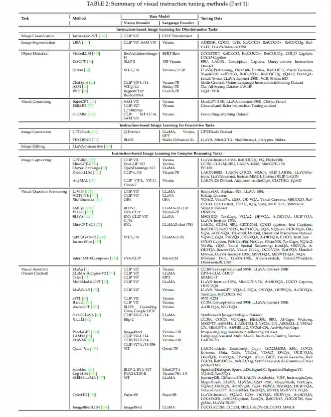 传统的计算机视觉通常通过专门的模型独立解决每个单一任务,任务指示隐式地设计在模型架构中,这引起了两个限制:(1) 它导致了特定于任务的模型,需要多个模型来处理不同的任务,限制了来自不同任务的潜在协同作用;(2) 它导致了一个预定义的且固定的模型接口,该接口在遵循用户的任务指示时具有有限的交互性和适应性。为了解决这些问题,最近积极研究了视觉指令微调(VIT),它通过将语言作为任务指示来微调一个大型视觉模型,旨在通过语言指示描述的各种视觉任务来学习一个通用的多模态模型,该模型可以遵循任意指示,从而解决用户指定的任意任务。这项工作旨在提供视觉指令微调的系统综述,涵盖:(1) 呈现计算机视觉任务范式和VIT发展的背景;(2) 介绍VIT的基础,包括常用的网络架构、视觉指令微调框架和目标,以及评估设置和任务;(3) 视觉指令微调和评估中常用的数据集;(4) 对现有VIT方法的回顾,根据所研究的视觉任务和方法设计对它们进行分类,并强调它们的主要贡献、优势和不足;(5) 对各种指令遵循基准上的VIT方法进行比较和讨论;(6) 视觉指令微调研究中的几个挑战、开放方向和可能的未来工作。****