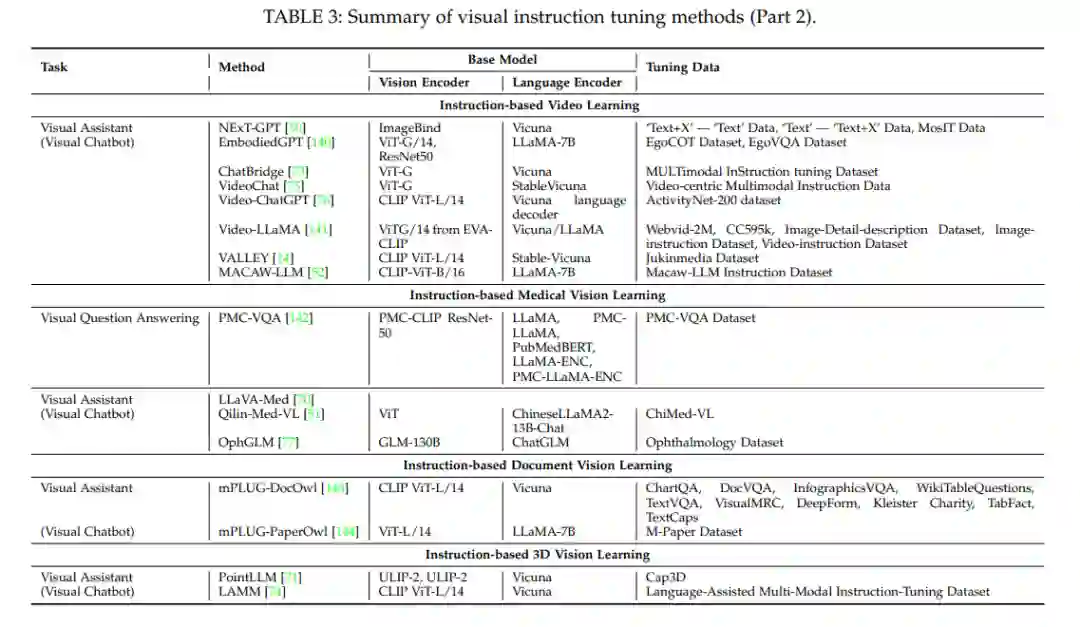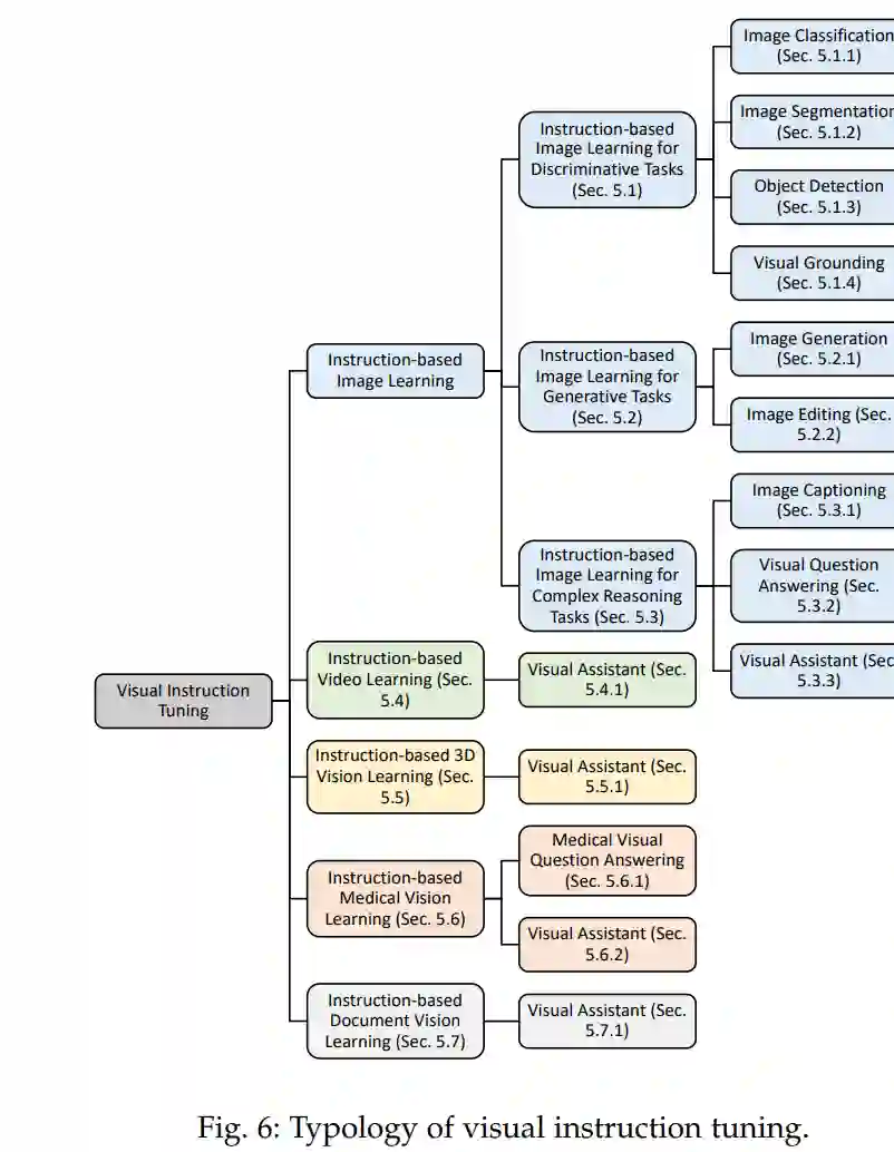 针对通用多模态模型的视觉指令调优已经被用于探索各种视觉任务,包括判别性任务、生成性任务、复杂图像推理任务、视频任务、医疗视觉任务、文档视觉任务和3D视觉任务,如表6所示。本节将根据表2和表3中列出的上述任务进行回顾。