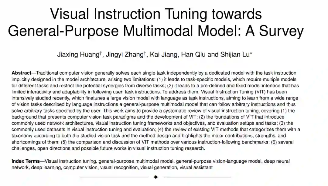 视觉指令调优通过将语言作为任务指令来微调大型视觉模型,最终从由语言指令描述的广泛视觉任务中学习,构建出一个能够遵循任意指令并因此解决用户指定的任意任务的通用多模态模型。在这项调查中,我们从不同的角度对视觉指令调优研究进行了广泛的回顾,范围从背景到基础、数据集、方法论、基准测试,以及当前的研究挑战和开放的研究方向。我们以表格形式总结了视觉指令调优的数据集、方法和表现,旨在提供一个全面的概述,展示我们已经取得了哪些成就,目前面临哪些挑战,以及在视觉指令调优研究中我们还能进一步取得什么成就。