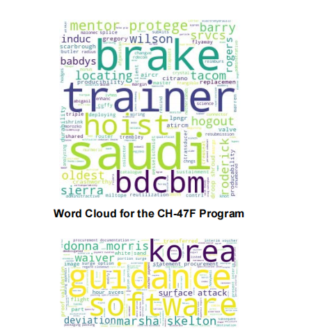 在步行阶段,通过在我们的数据上训练机器学习算法来评估合同数据,以回答相对简单的问题。这项活动确保了数据集具有合理的质量,机器学习算法运行正常,并能产生合理的答案。在这个阶段,每个程序都产生了词云。下图显示了两个程序的词云,分别是CH-47F和ATACMS-APAM。