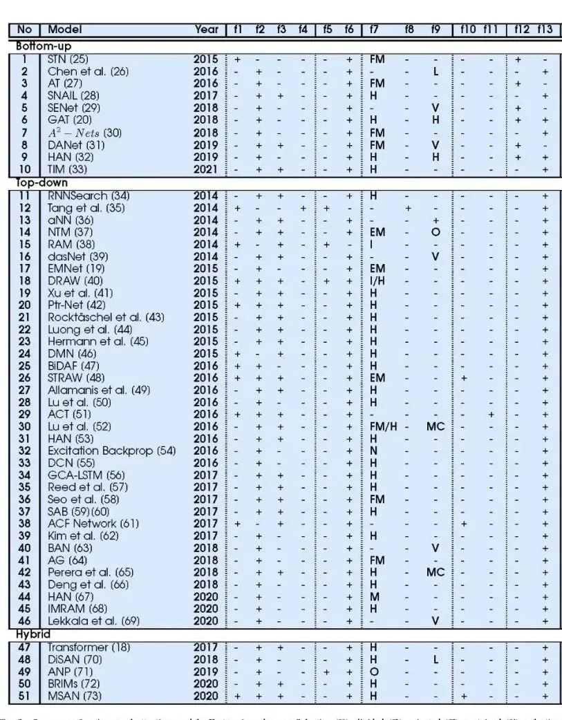 主要神经注意力模型总结。因素依次为: 选择性(f1)、分割(f2)、定向(f3)、持续性(f4)、选择性感知(f5)、选择性认知(f6)、基于位置(f7)、基于对象(f8)、基于特征(f9)、任务导向(f10)、时间导向(f11)、无状态(f12)、有状态(f13)、硬状态(f14)、软状态(f15)。在基于位置的列(f7)中: 隐藏状态/数据嵌入(H)、外部存储单元格(EM)、特征地图(FM)、输入数据(I)和其他(O)。在基于特征的列(f9)中: 视觉(V)、语言(L)、记忆细胞(MC)、隐藏状态(H)和其他(O)。