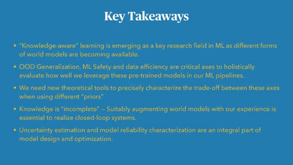 随着不同形式的世界模型的出现,“知识感知”学习正在成为语言学习的一个重要研究领域。•OOD泛化、ML安全性和数据效率是全面评估我们在ML管道中利用这些预先训练模型的效果的关键轴。•当使用不同的“先验”时,我们需要新的理论工具来精确地描述这些轴之间的权衡。•知识是“不完整的”——用我们的经验适当地增强世界模型对实现闭环系统至关重要。•不确定性估计和模型可靠性描述是模型设计和优化的一个组成部分。